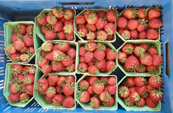 verse bladgroenten, rode bieten en aardbeien.