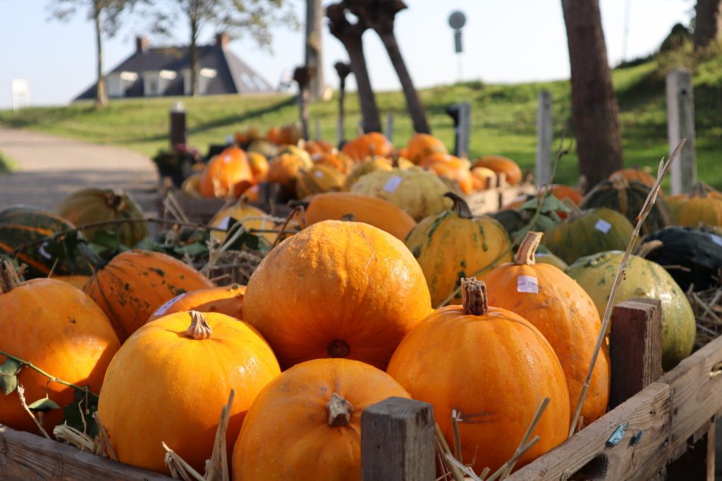 appels, peren en pompoenen langs de weg.